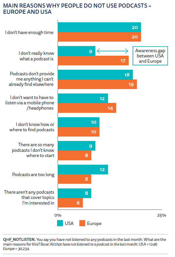 When it comes to the main reasons why people do not listen to podcasts, in the US this is led by not having enough time (20 per cent), lack of unique content (18 per cent), length (12 per cent) and having to listen "via a mobile phone or headphones" (12 per cent).
