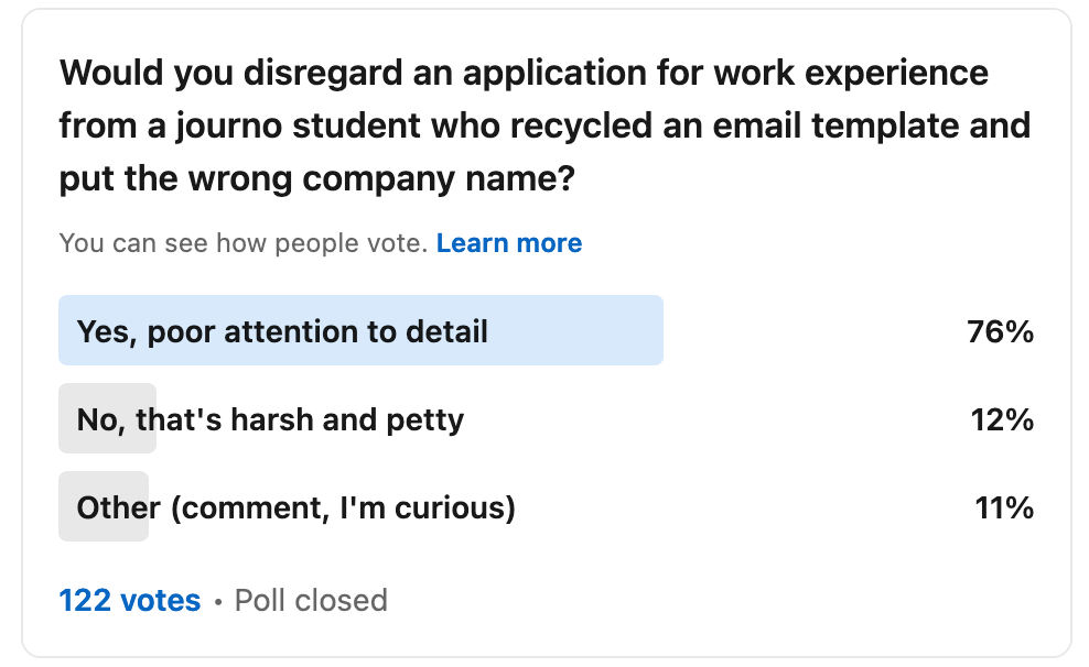 Two journalism students emailed us using the wrong company name in the same week. I binned both applications. Did I do the right thing? I asked our community to weigh in