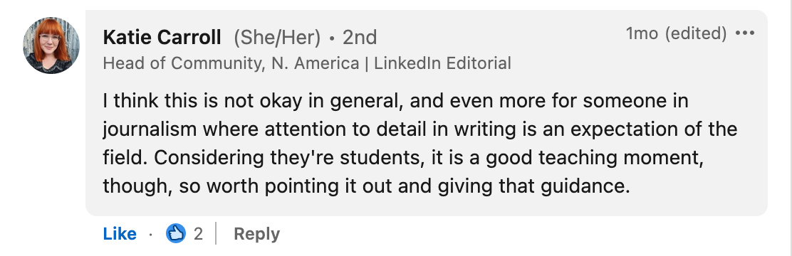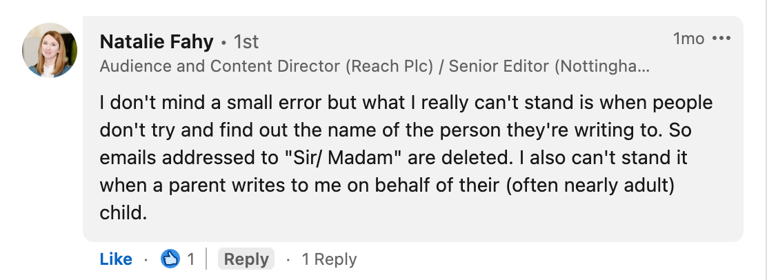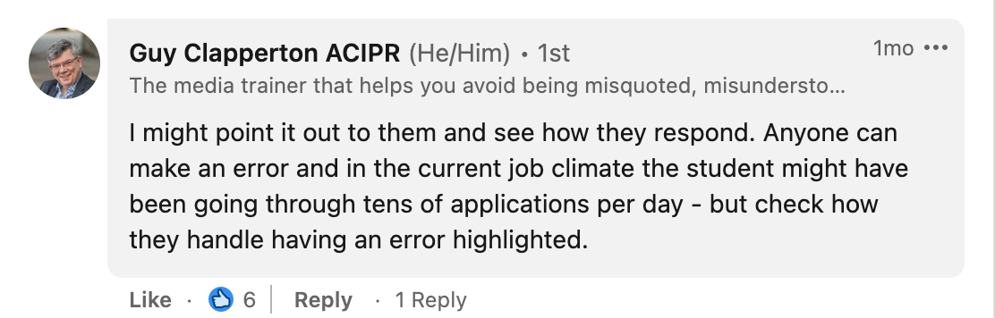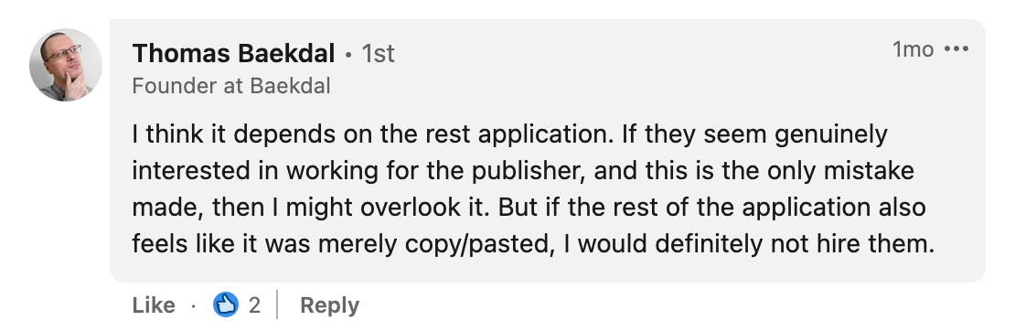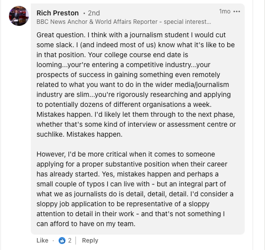 Despite that, we try to take on as many journo students as we can. So when last month we received not one but two applications where the students did not double-check the sender and put the wrong company name, I turned them down. But then I had a bad conscience. I was pondering over and over again whether we could afford to bring in someone with poor attention to detail, risking mistakes and doubling our workload. Was I too harsh and petty, overblowing a small mistake?