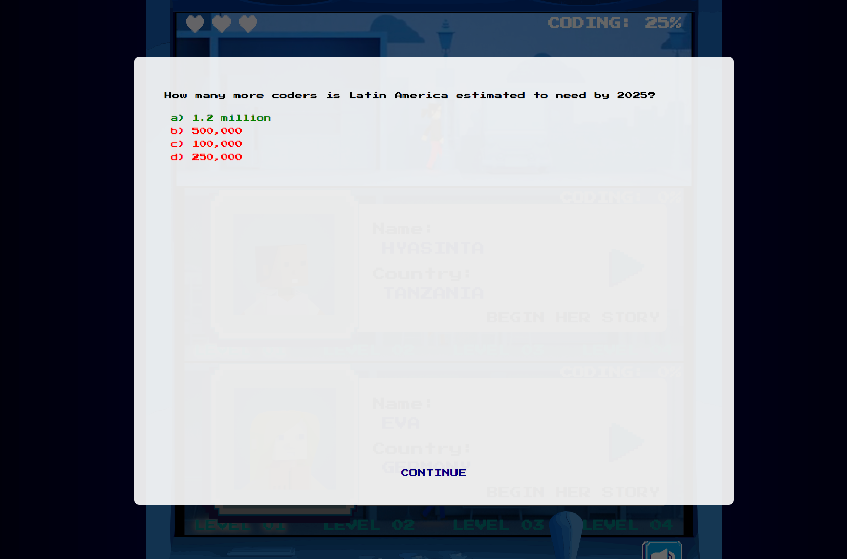 The viewer gets to choose which 'character' they follow, female coders Angie, Hyasinta and Eva, and watch a short video package, followed by a quiz question based on what they had just seen.